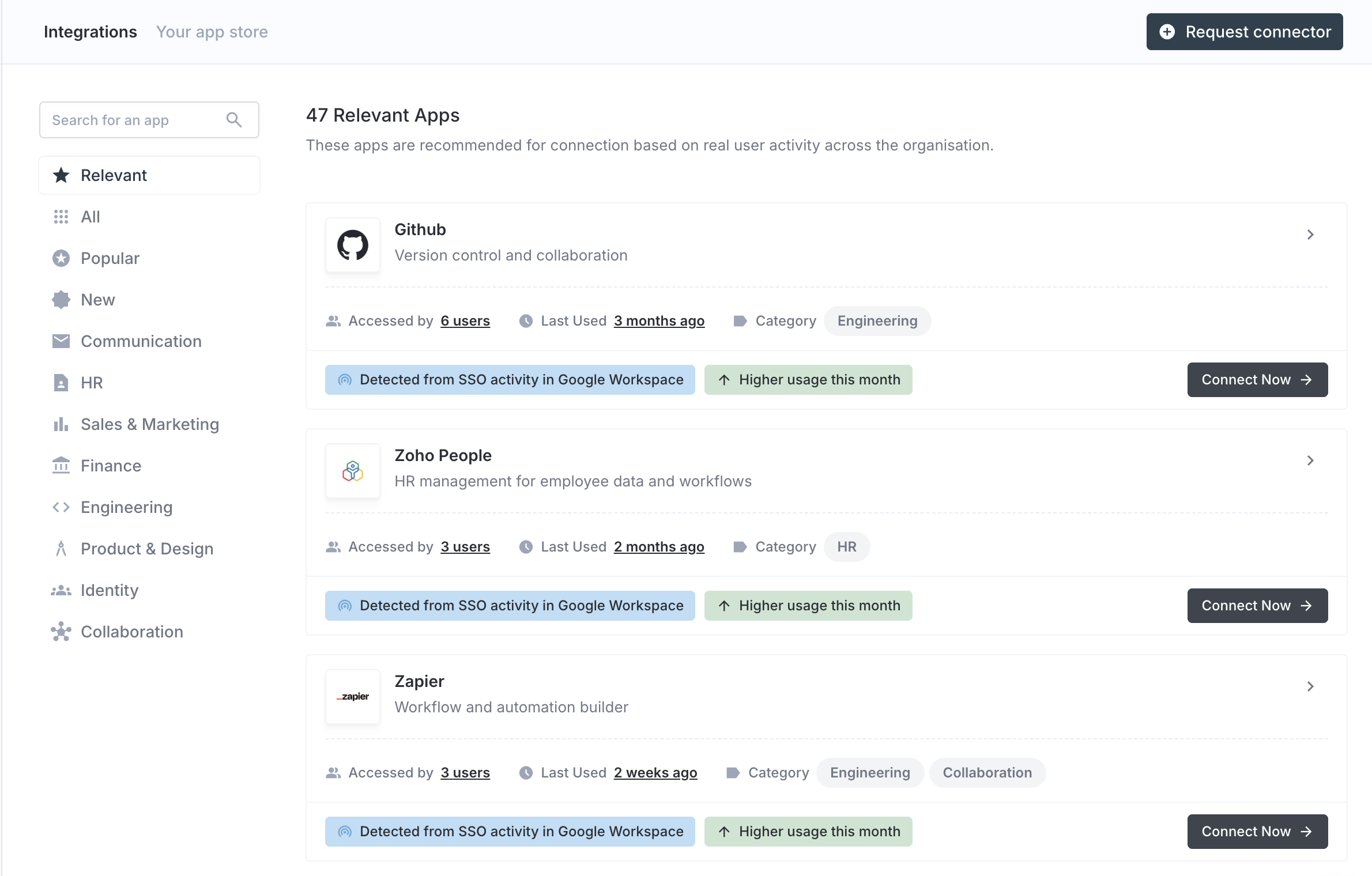 Browse or search for the app you want to connect. For example, you might choose Slack, GitHub, Google Workspace, or Salesforce. Click the app to begin.