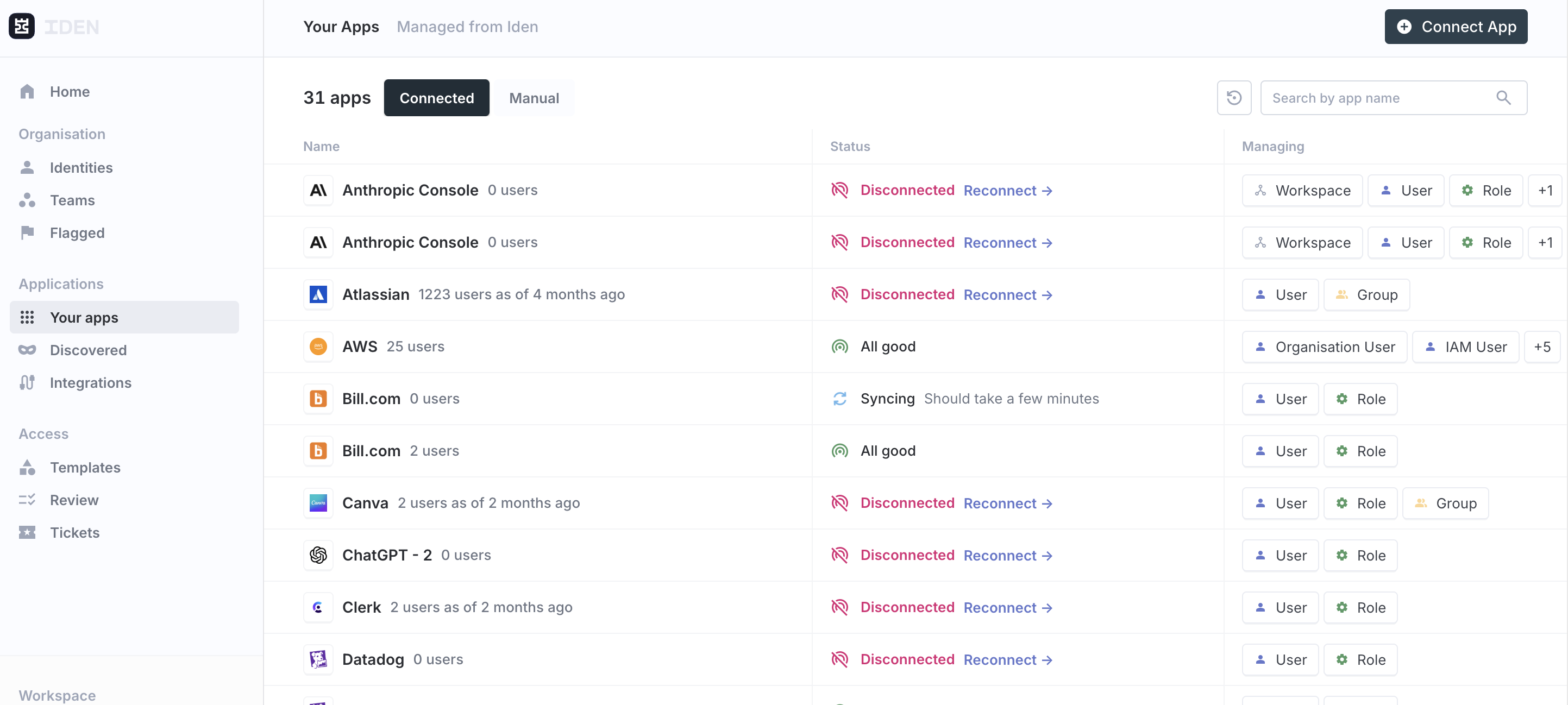 This guide walks you through connecting an application to Iden for the first time. Once connected, Iden will automatically sync (copy and keep up to date) the users and their permissions from that app. You will then be able to run access reviews and manage who has access - all from one place.