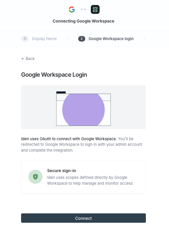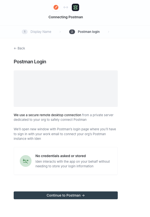 Click Continue to [App], then sign in with your work account in the browser window that opens. Iden will detect the connection automatically.
