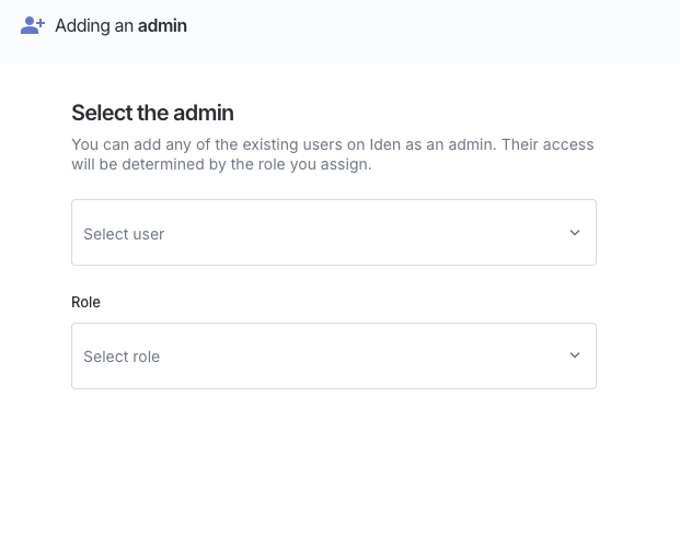 Once you have selected both a user and a role, click Add admin. Their new permissions will take effect the next time they sign in to Iden.
