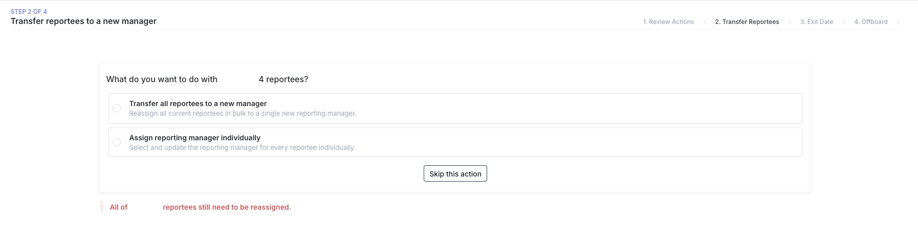 If the employee manages other people, you will need to reassign those direct reports. Choose one of these options: