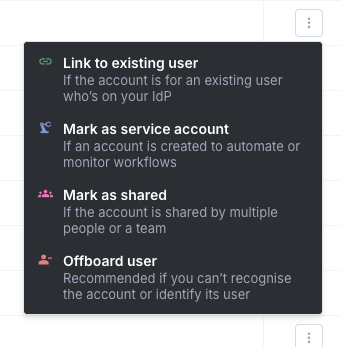 Service and shared accounts are excluded - Iden flags these separately because removing a shared account could affect other people who use it. Handle these manually after the offboarding is submitted.